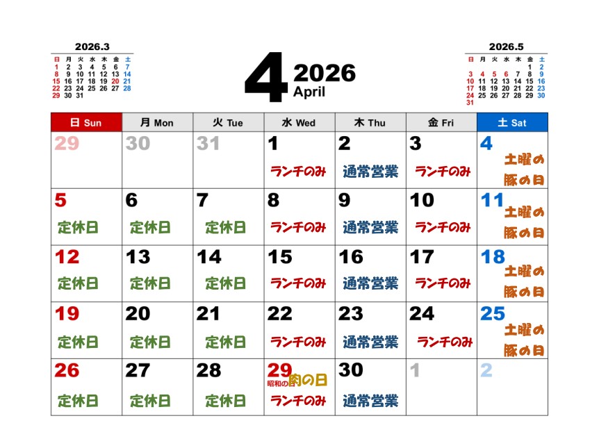豚丼普通盛り・カレー丼・生姜焼き・ホークソテー普通盛り